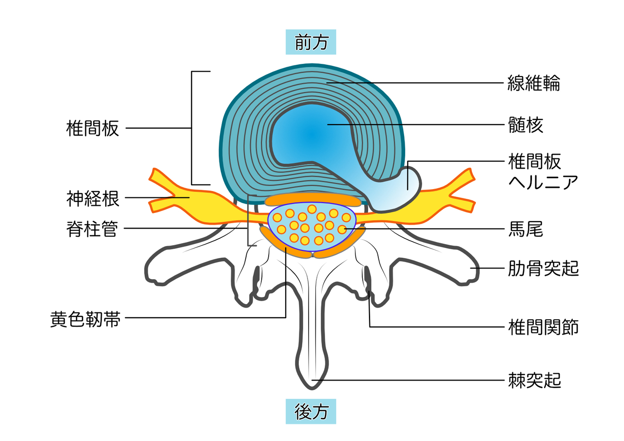 飛び出した部分が神経を圧迫すると、腰やお尻、足にかけての痛み・しびれ・力が入りにくいといった症状が出ます。