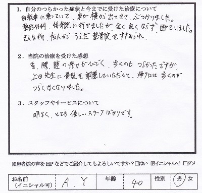 今まで他の治療院にたくさん行ったり、整形外科やレーザー手術を3回しましたが、良くなりませんでした。