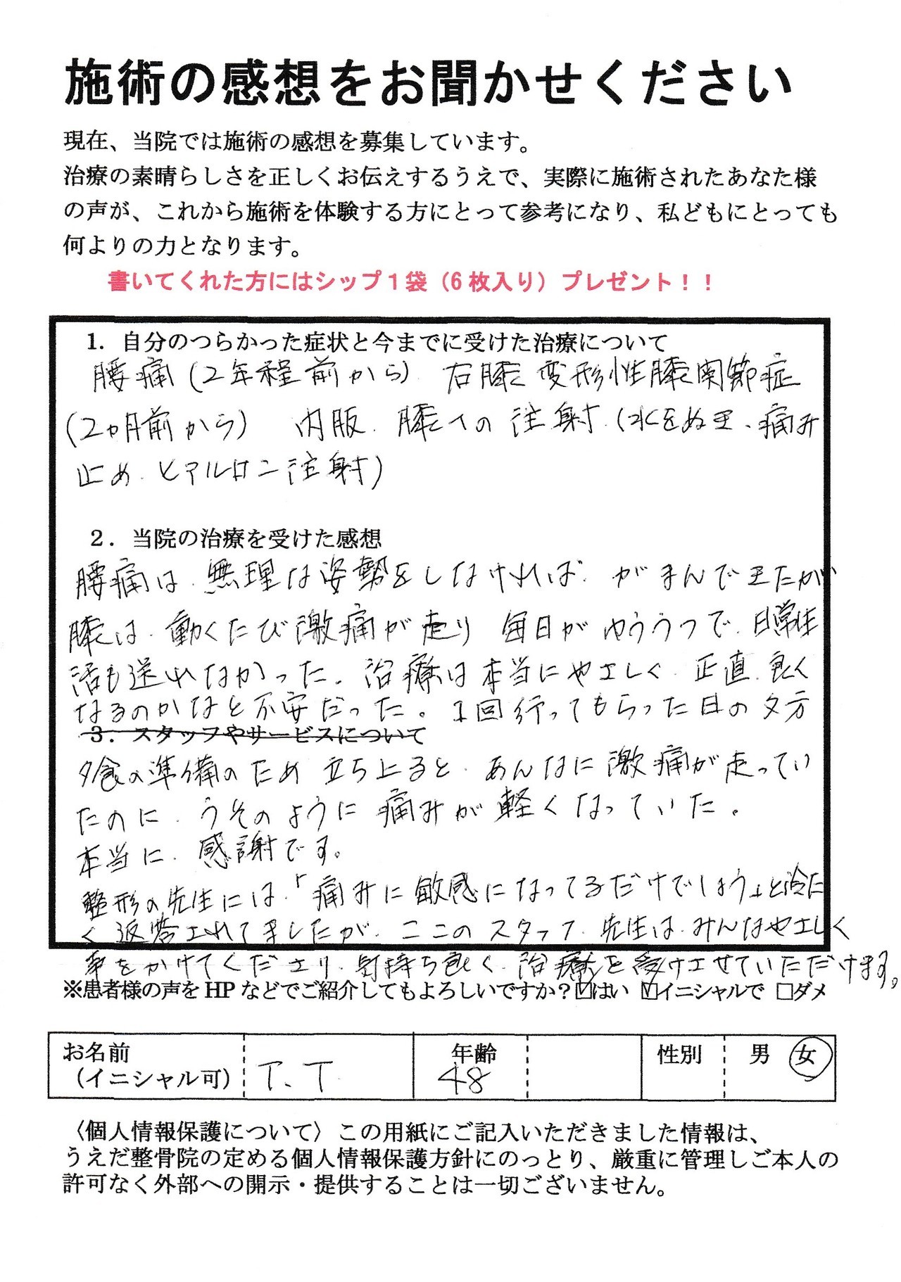 腰痛は無理な姿勢をしなければがまんできたが、膝は動くたびに激痛が走り毎日がゆううつで、日常生活も送れなかった。治療は本当にやさしく、正直良くなるのかなと不安だった。1回行ってもらった日の夕方、夕食の準備のため立ち上がると、あんなに激痛が走っていたのにうそのように痛みが軽くなっていた。 本当に感謝です。 整形の先生には「痛みに敏感になっているだけでしょう」と冷たく返答されてましたが、ここのスタッフ、先生はみんなやさしく事をかけてくださり、気持ちよく治療を受けさせていただけます。