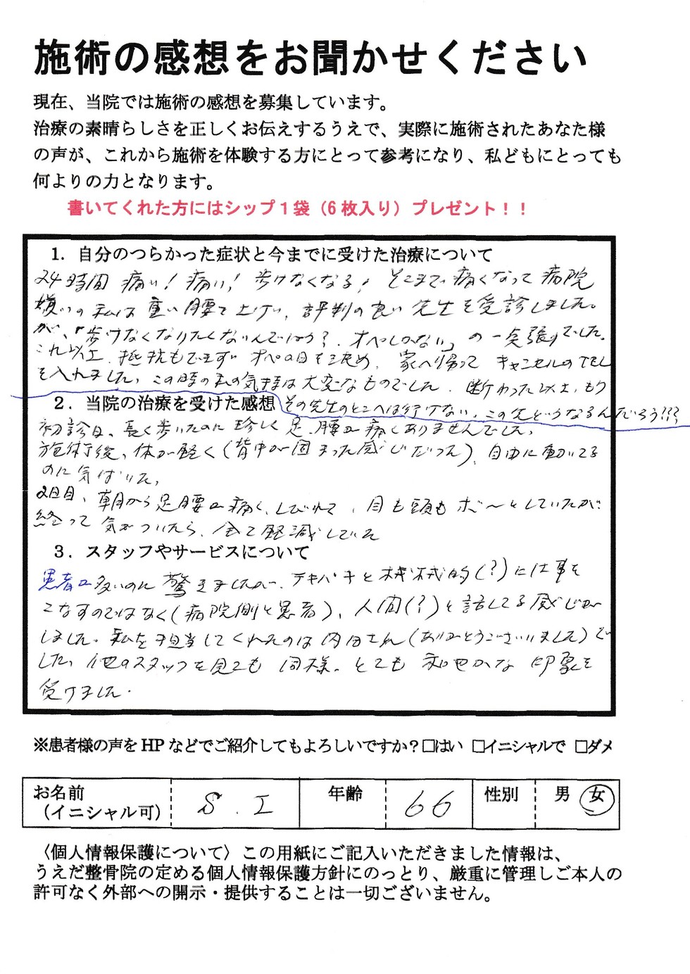 兼業農家で30代からの事務職と農作業で慢性の肩こり、腰痛でマッサージ、針治療は欠かせませんでした。今回は左足の痛みで歩行困難になってしまい、すべり症と診断され、薬で安静に…。又は手術とのことでした。家族が必至でセカンドオピニオンを捜してくれ、うえだ整骨院にお世話になりました。